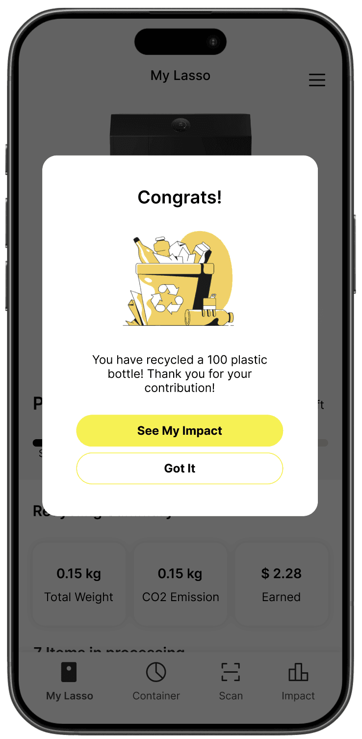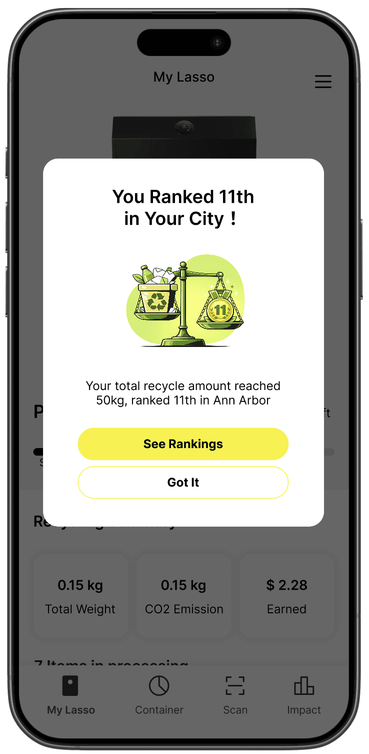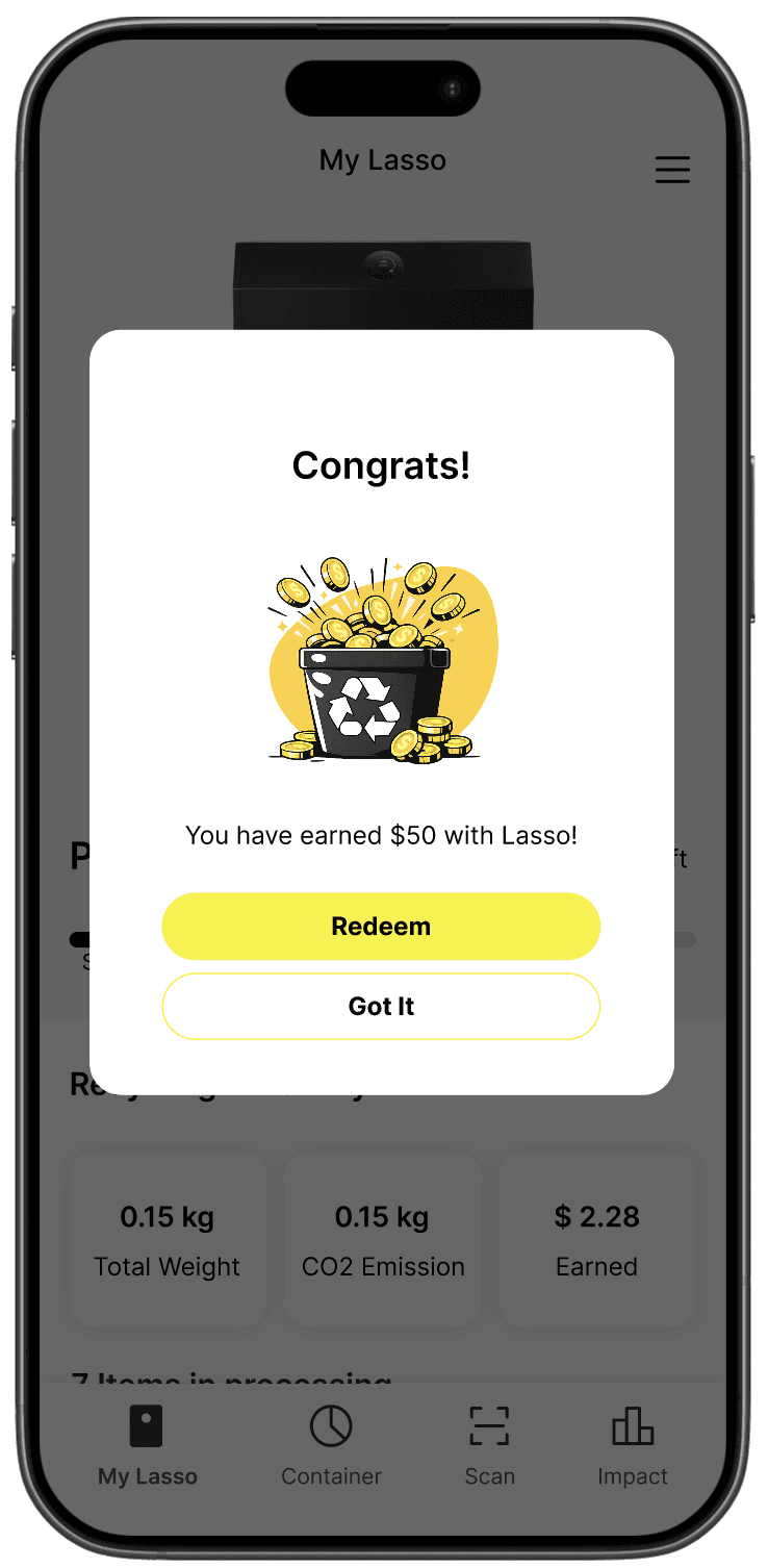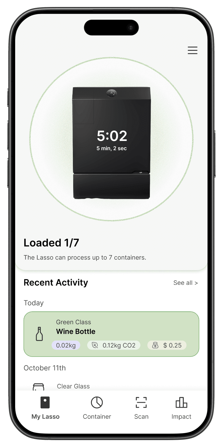 The Lasso Machine is a home recycling appliance that lets households recycle and sell materials while boosting efficiency and recovery rates. To maximize its value, users needed a simple way to monitor and control the machine. The Lasso App was created to bridge that gap, making recycling easier, smarter, and more rewarding.